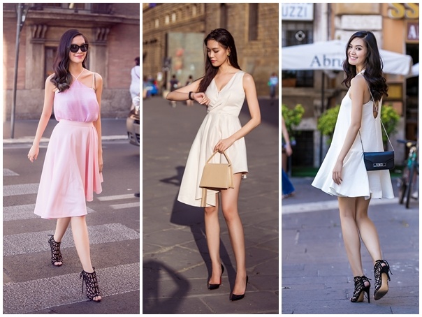 | Vào trung tuần, hoa hậu Thùy Dung khoe phong cách street style khi có chuyến du lịch Italy hồi cuối tháng 6. Trên đường phố, người đẹp Việt diện mốt váy màu nhã nhẹ nhàng, thanh thoát. Vóc dáng cao ráo cùng trang phục đẹp giúp cô nổi bật. |