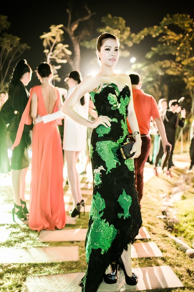 Tham dự sự kiện kỷ niệm 10 năm một tạp chí tại TP HCM, người đẹp Quách An An chọn trang phục gợi cảm hợp phong cách. Bộ váy chất liệu ren pha màu đen xanh tôn làn da trắng và vóc dáng thanh mảnh của người mặc.