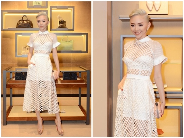 | Ca sĩ Tóc Tiên trở thành điểm nhấn sexy tại sự kiện nhờ bộ cánh lưới xuyên thấu cá tính cũng đến từ NTK Lý Quí Khánh. Thiết kế bra-top và chân váy bút chì bên trong đồng màu rất ăn nhập tổng thể. Hình tượng của giọng ca Tóc mây thêm phần mới lạ nhờ mái tóc bạch kim và trang điểm viền mắt đậm cuốn hút. |
