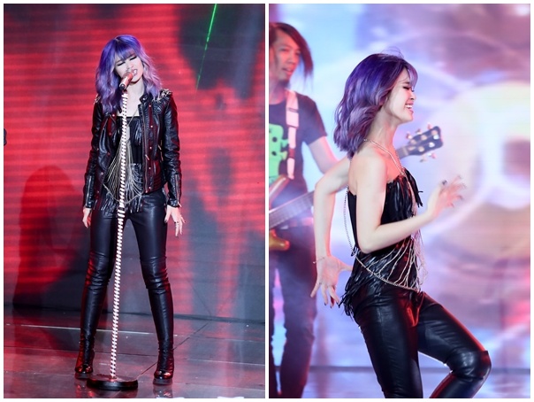 | Trên sân khấu live show 8 chương trình The Remix, ca sĩ Đông Nhi chọn trang phục hơi hướm rock chic, giúp cô tạo được ấn tượng hình ảnh đẹp đến giám khảo và công chúng. Thậm chí, để đầu tư cho tiết mục, giọng ca 30 ngày yêu còn nhuộm tóc tím, ăn nhập cùng bộ cánh chất liệu da, phục kiện độc đáo. |