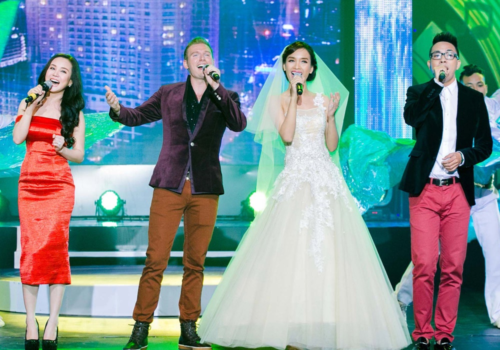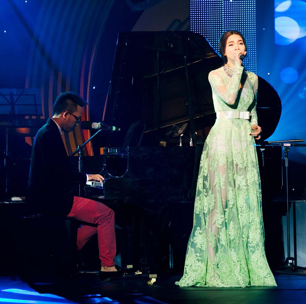 | Nguyễn Hồng Thuận đích thân đệm đàn cho phần biểu diễn của Hồ Ngọc Hà. |