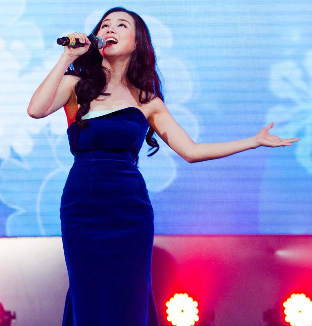| Nữ ca sĩ khoe vẻ gợi cảm và yêu kiều trong chiếc đầm màu xanh được thiết kế vừa với phom người của cô. |