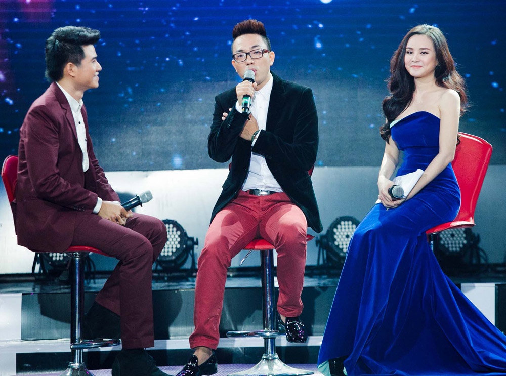 | Cũng trong chương trình, Vy Oanh đảm nhận vai trò MC bên cạnh Vũ Mạnh Cường. Cả hai cùng giao lưu với nhạc sĩ Nguyễn Hồng Thuận - nhân vật chính của đêm nhạc. Tác giả của hàng loạt hit đình đám cho biết anh xúc động khi nghe Vy Oanh hát ca khúc của mình cũng như chia sẻ cảm xúc trong suốt hơn 10 năm sáng tác nhạc. |