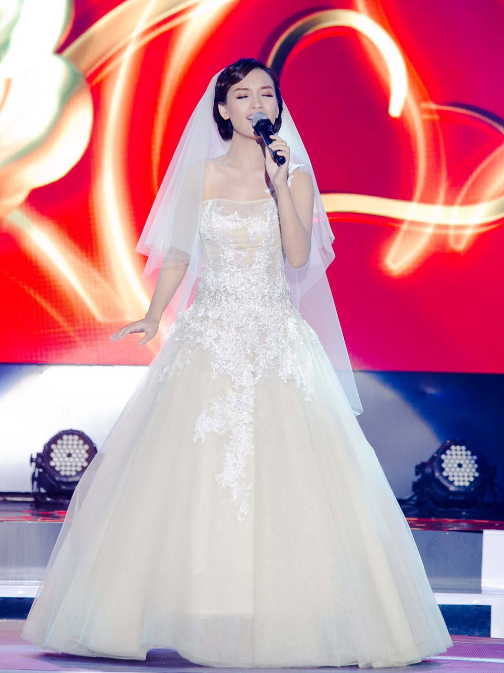 | Ái Phương mặc váy cô dâu trên sân khấu để phù hợp với ca khúc Cô dâu do Nguyễn Hồng Thuận sáng tác tặng cô năm ngoái. |