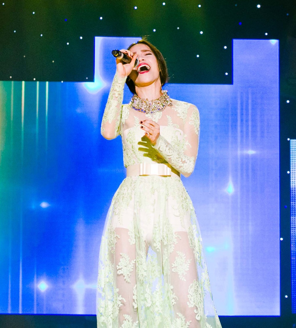 | Vy Oanh vừa hát vừa làm MC trong chương trình Nhịp cầu âm nhạc số cuối cùng của năm 2013. Trong chiếc váy đuôi cá màu xanh của nhà thiết kế Huy Trần dành riêng cho cô. Nữ ca sĩ khoe nhan sắc rạng rỡ và đường cong gợi cảm. |
