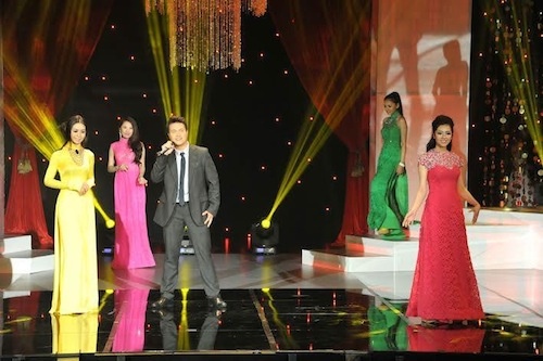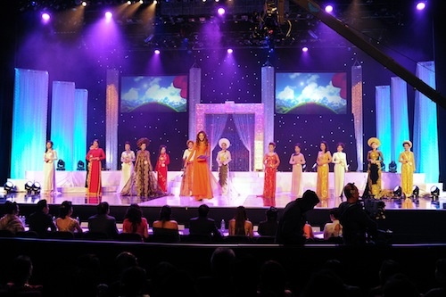| Võ Hoàng Yến và các thí sinh trong phần thi áo dài đêm chung kết Hoa hậu Phu nhân người Việt Thế giới trực tiếp thu hình với đạo diễn và chuyên viên thu hình từ Hollywood. |
