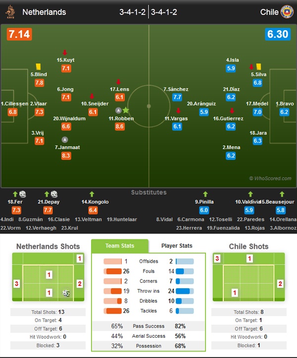 Không có sự phục vụ của Van Persie do án phạt thẻ, HLV Van Gaal điều chỉnh đội hình thi đấu khi bố trí đội hình 3-5-2 với cặp tiền đạo Robben - Lens. Bên kia chiến tuyến, Chile ra sân với cặp tấn công Sanchez - Vargas trong sơ đồ chiến thuật 3-5-2.