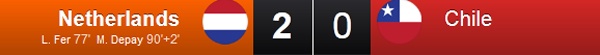 Kết thúc trận đấu, ĐT Hà Lan đánh bại Chile với tỷ số 2-0.