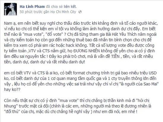 Cô chia sẻ: “Em biết thế nào là "mua vote", "đổ vote"? Chị đã từng tham gia Bài hát yêu thích năm ngoái và công ty kiểm toán họ còn gọi đến những thuê bao đã nhắn tin bình chọn cho chị để kiểm tra xem có phải sim rác hoặc hack không. Tất cả số lượng vote đều được công ty kiểm toán ,VTV và Cát Tiên Sa nắm giữ, họ đương nhiên không để yên cho ai có ý định làm điều sai nguyên tắc! Đây ko phải trò chơi, mà là vấn đề tiền, tiền, và rất nhiều tiền, danh dự, danh dự và rất nhiều danh dự!”.