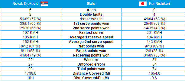Bất chấp trải qua trận đấu căng thẳng, kéo dài hơn 4 tiếng rưỡi đồng hồ với Gilles Simon tại vòng 4, Novak Djokovic vẫn tràn đầy sức mạnh khi chạm trán Kei Nishikori. Nhà đương kim vô địch thể hiện bản lĩnh và đẳng cấp trong cả 3 set đấu để đánh bại hạt giống số 7 người Nhật với các tỷ số 6-3, 6-2, 6-4.