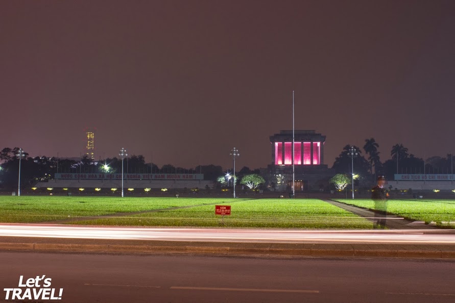 Hành trình của tôi bắt đầu từ 9h tối, điểm đến đầu tiên là Lăng Bác với ý định xem hạ cờ. Nhưng thật tiếc là tôi nhầm giờ nên đến muộn, lễ hạ cờ đã kết thúc. Nếu muốn xem được tôi phải có mặt ở đây lúc 8h30, khi buổi lễ hạ cờ kết thúc quảng trường Ba Đình vắng người hơn hẳn.
