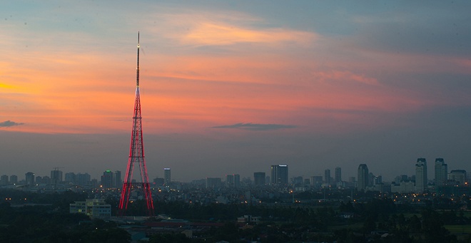 | Tháp truyền hình Hà Nội đỏ rực khi nắng sắp tắt. |