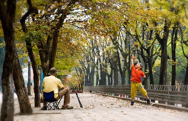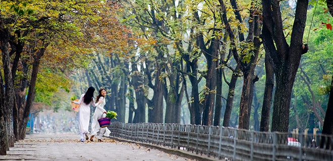 | Áo dài đùa nghịch, tung tăng dưới hàng cây lãng mạn nhất thủ đô. |