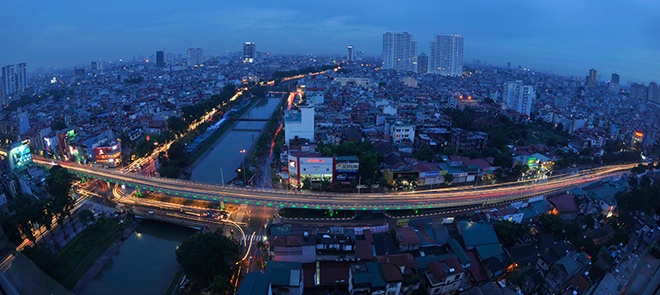 | Cầu vượt bắc qua sông Tô Lịch rực sáng ánh đèn xe khi trời nhập nhoạng tối. |