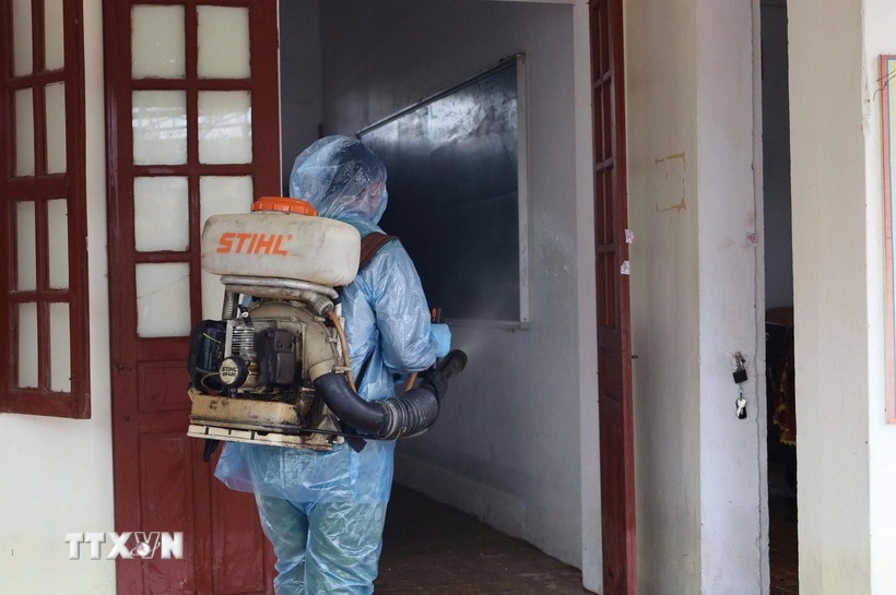 Phun hóa chất diệt khuẩn sau mưa, bão. Ảnh: Công Tường/TTXVN. |
