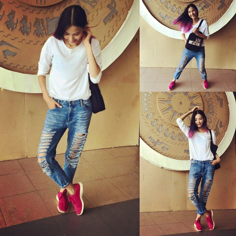 | Cô tiếp tục lăng xê mốt quần xé rách táo bạo khi mix - match đơn giản cùng áo thun tay dài. Mái tóc nhuộm màu loang mang lại nét phá cách cho tổng thể. |
