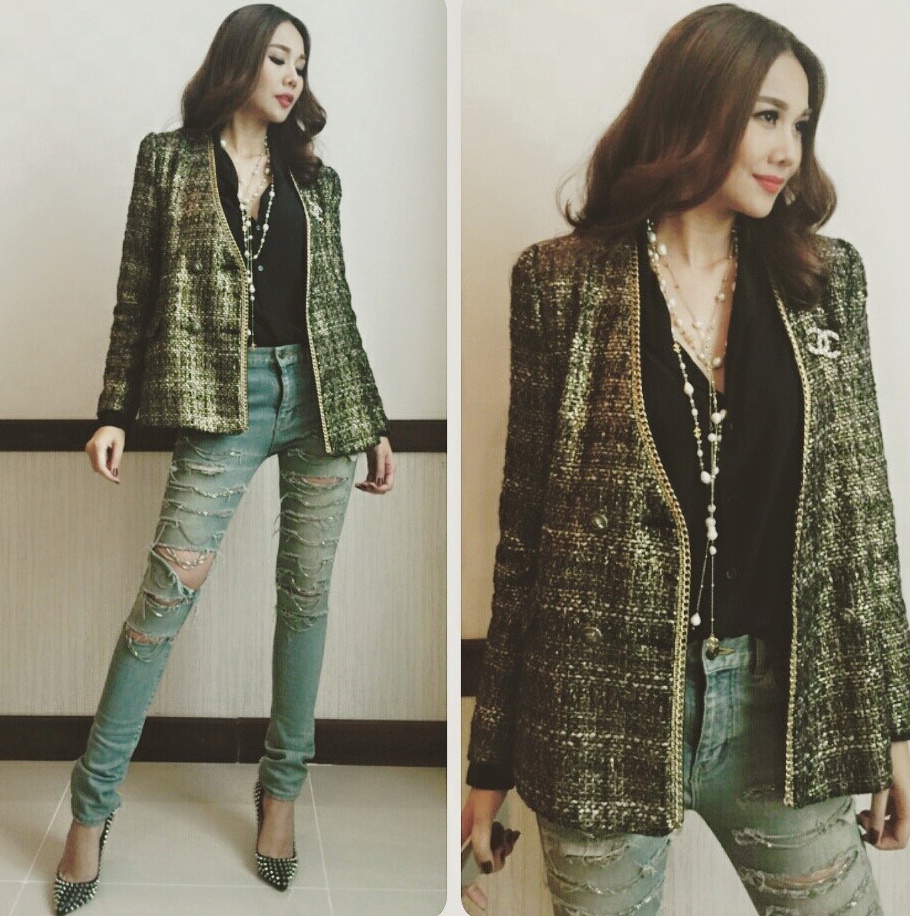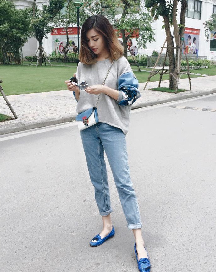 | Một ngày khác, nữ giám khảo chương trình Tìm kiếm người mẫu Việt nam 2015 chọn cách phối quần jeans xé bụi phủi và áo vest thanh lịch. Hình tượng thời trang cá tính, nổi loạn của chân dài luôn được các tín đồ sành mốt hưởng ứng. |