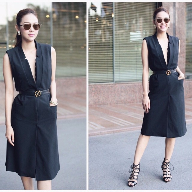 | Nổi bật trên đường phố Sài thành cuối tuần, Minh Hằng thu hút trong bộ cánh tông đen, cổ chữ V sâu gợi cảm. Trang phục phong cách cổ điển được mix - match ăn ý cùng phụ kiện giày sandals dây và kính râm sành điệu. |
