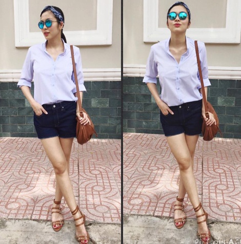 | Một ngày khác, "cô Trúc" của Bỗng dưng muốn khóc khoe vóc dáng với sơ-mi, quần sooc và giày sandals dây hiện đại, tạo phong cách ngày hè khỏe khoắn. |