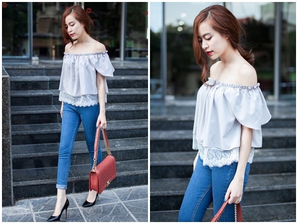 | Trong khi đó, Hoàng Thùy Linh xuống phố Hà thành với mốt thời trang sexy. Áo trễ vai, quần jeans ôm sát tôn vóc dáng gợi cảm của người mặc. |