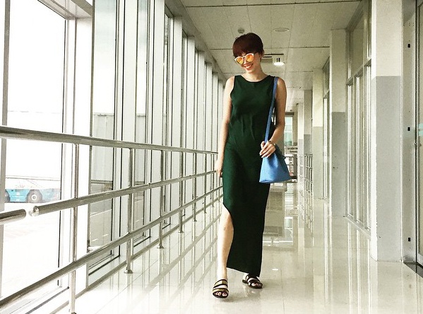 | Không chọn phong cách sắc màu, nổi loạn như những tuần trước, Tóc Tiên của những ngày cuối tháng 5 có phần đơn giản, năng động trong bộ đầm xẻ tà gam xanh trầm. |