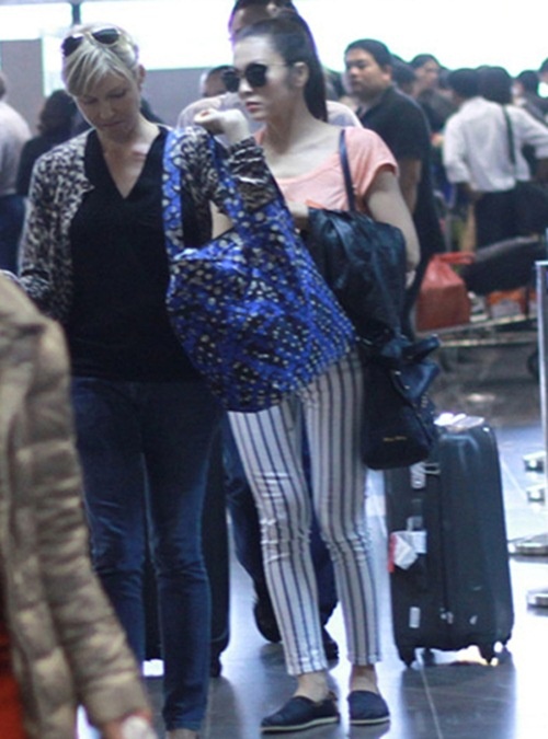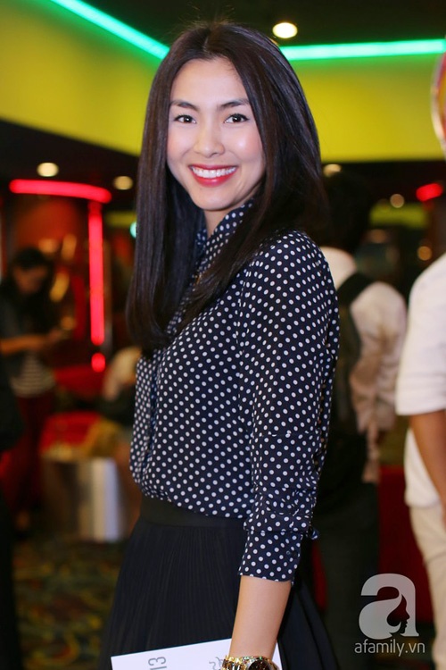 Trang phục đơn giản của Hà Tăng với sơ mi chấm bi, quần jeans và túi to bản.