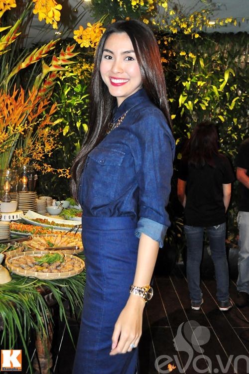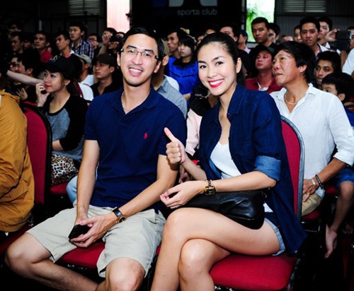 Hà Tăng trẻ trung khi xuất hiện cùng chồng với sơ mi denim, short ngắn.