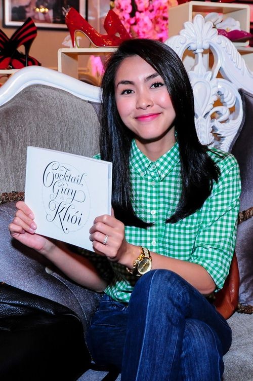 Hà Tăng nhí nhảnh với chiếc sơ mi kẻ và quần jeans khi đi dự lễ ra mắt sách của cô bạn thân Đinh Ngọc Diệp
