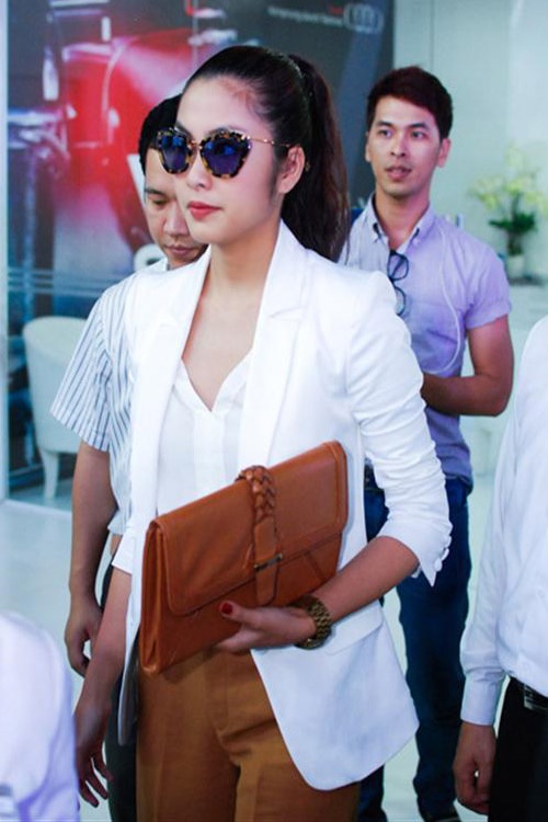 Cô khoe vẻ thanh lịch với blazer trắng, quần suông và phụ kiện tông nâu.