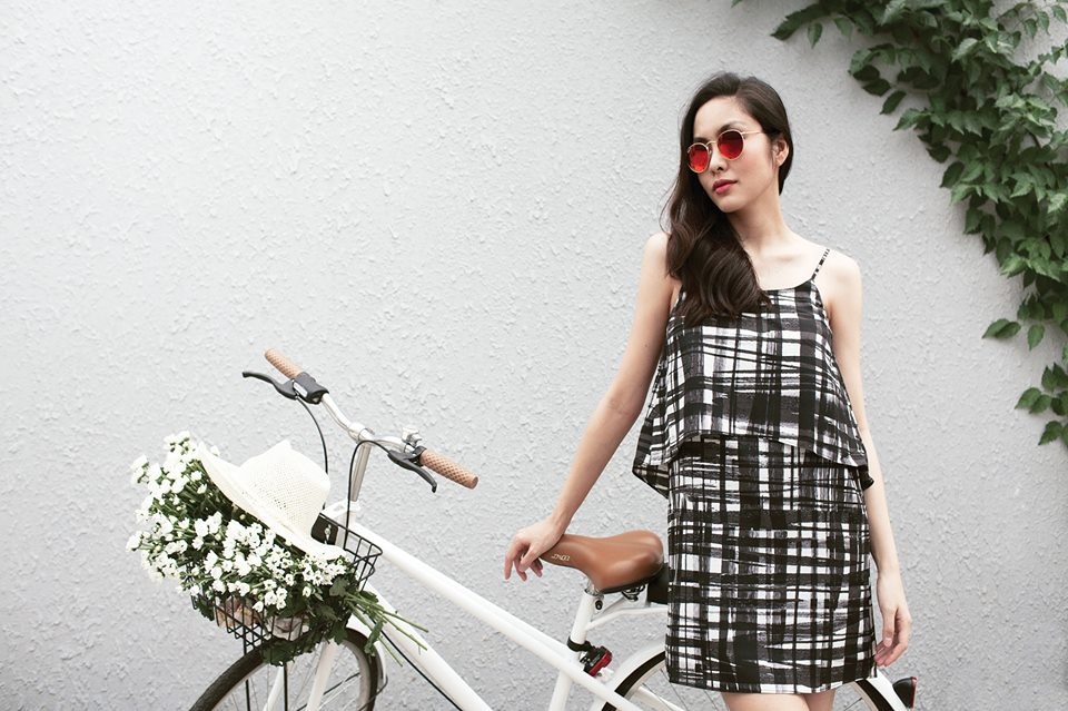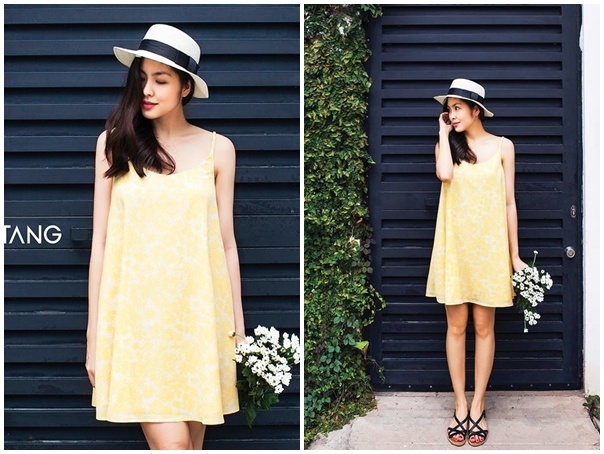 | Gu thời trang ngày hè của bà xã doanh nhân Louis Nguyễn chú trọng tính ứng dụng cao, tạo sự thoải mái, tiện lợi khi dạo phố và đến nơi làm việc. Trong ảnh, ngọc nữ diện mẫu đầm hai dây, họa tiết trắng đen. Thiết kế có độ ngắn vừa phải tạo sự trẻ trung, hiện đại. |