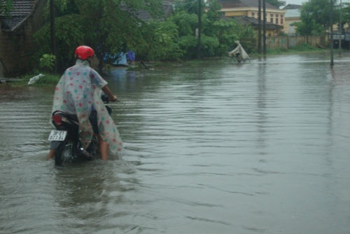 | Nhiều tuyến đường ở Hà Tĩnh bị ngập sâu trong nước. |