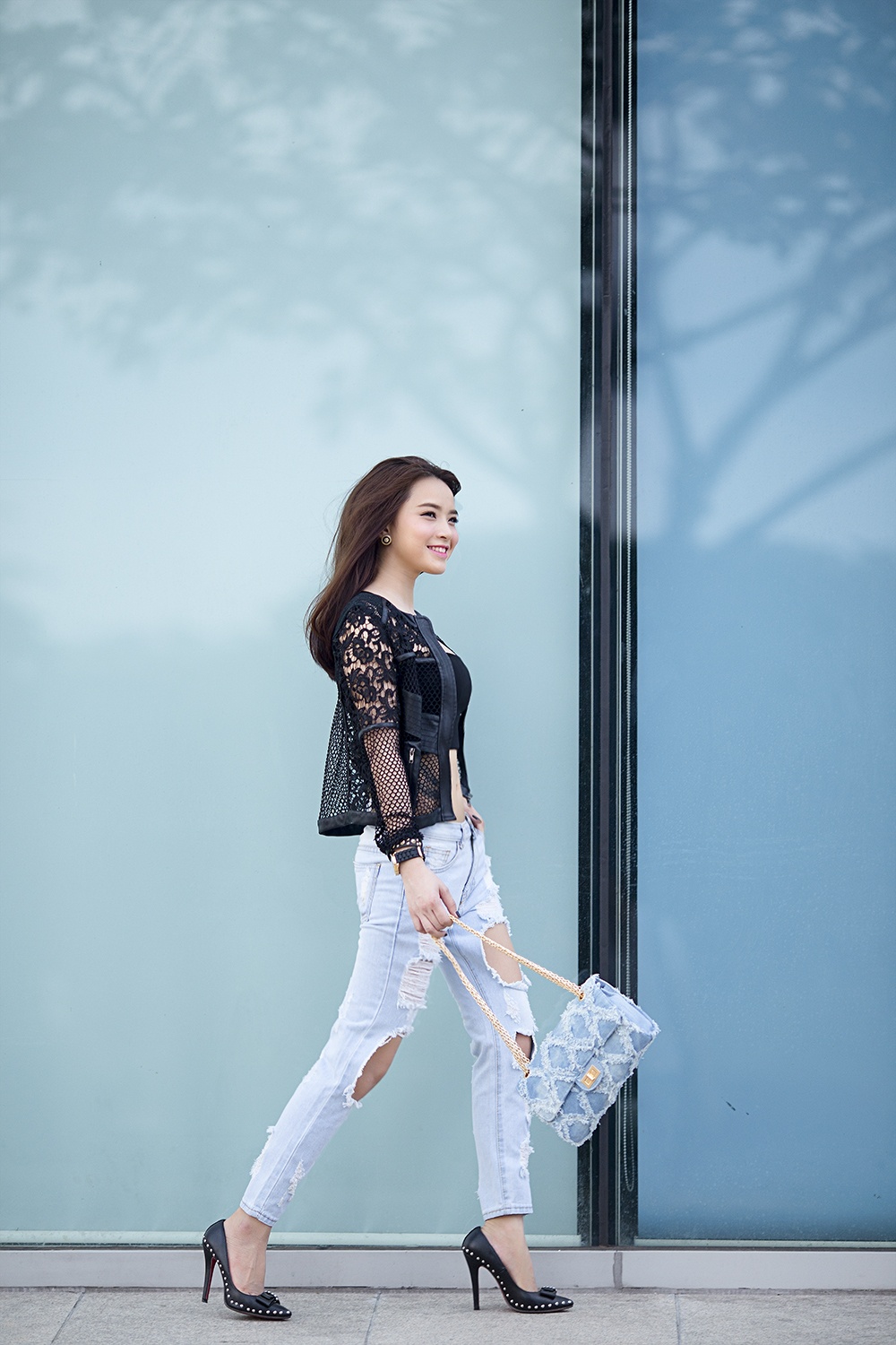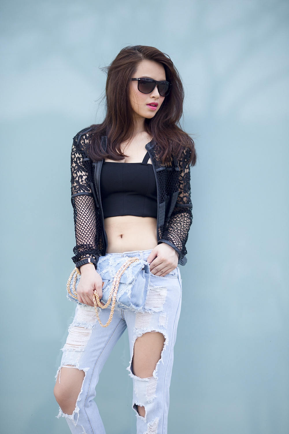 | Nữ ca sĩ chọn trang phục quần jeans xé, áo crop-top hiện đại, bên ngoài là áo khoác voan lưới, để lộ vòng eo thon gọn, gợi cảm. |