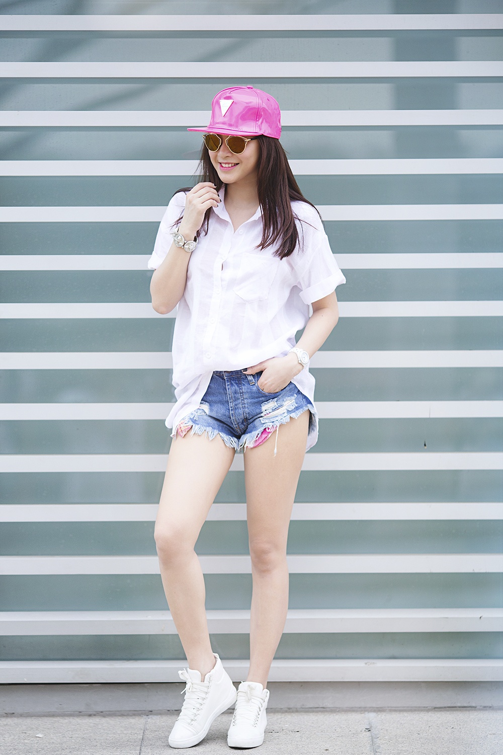 | Áo sơ-mi trắng thuộc list trang phục được nhiều người đẹp Việt ưa chuộng, Hải Băng cũng nằm trong số đó. Bạn gái cũ của Tiến Dũng (The Men) mix - match ăn ý cùng quần jeans ngắn, phụ kiện ngày hè nổi bật. |