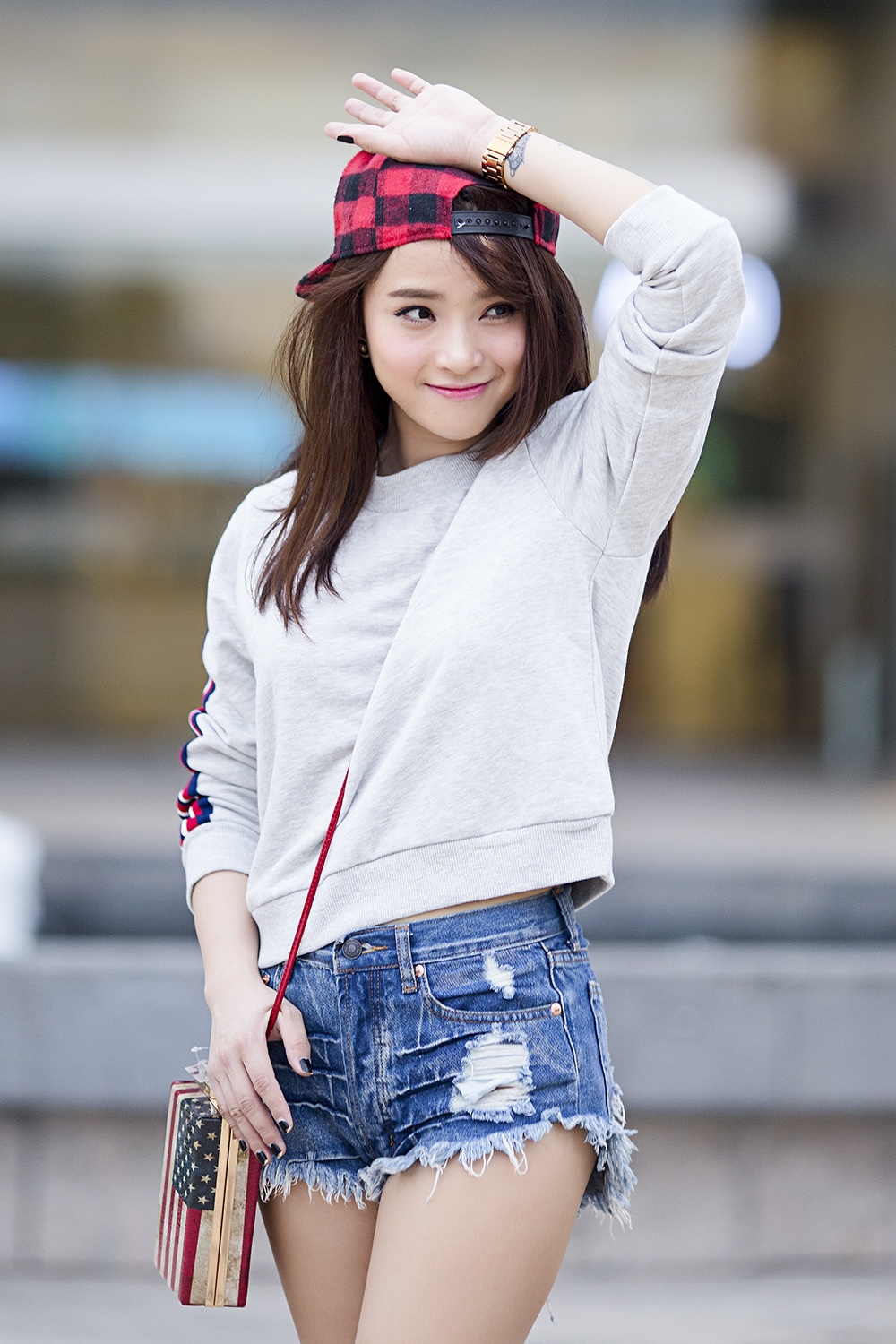 Áo nỉ tông xám đi cùng quần shorts, giày bata, túi xách hộp, mũ lưỡi trai giúp Hải Băng trẻ trung, nghịch ngợm khi hẹn hò, gặp gỡ bạn bè, người hâm mộ cuối tuần.
