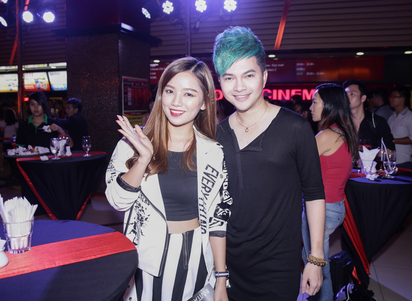 | Ca sĩ Nam Cường nhí nhảnh bên hot girl Hạ Anh. |