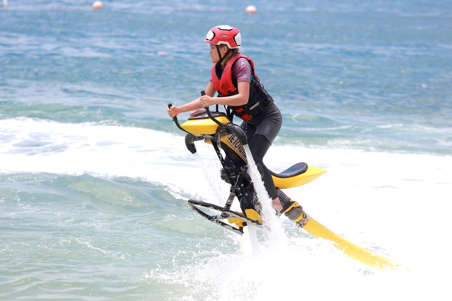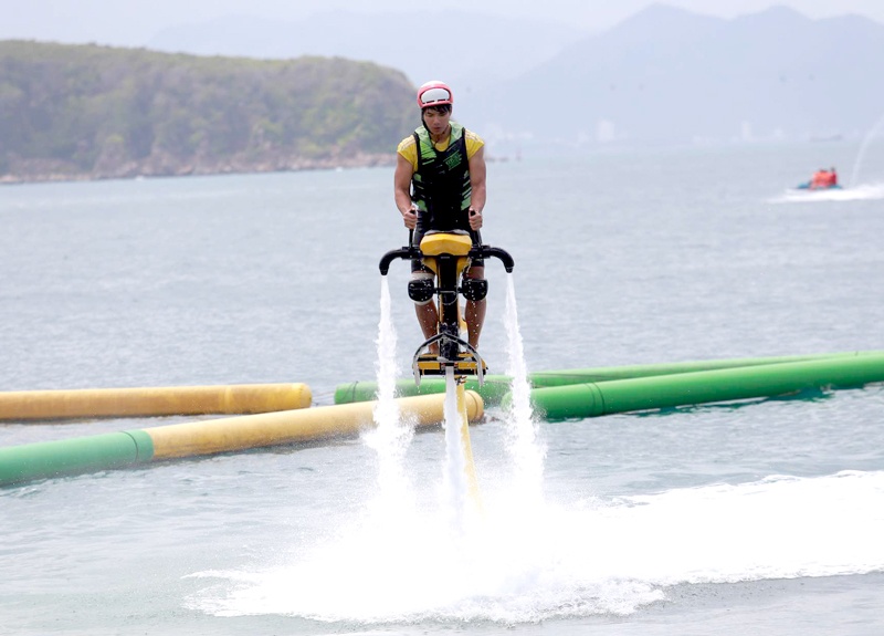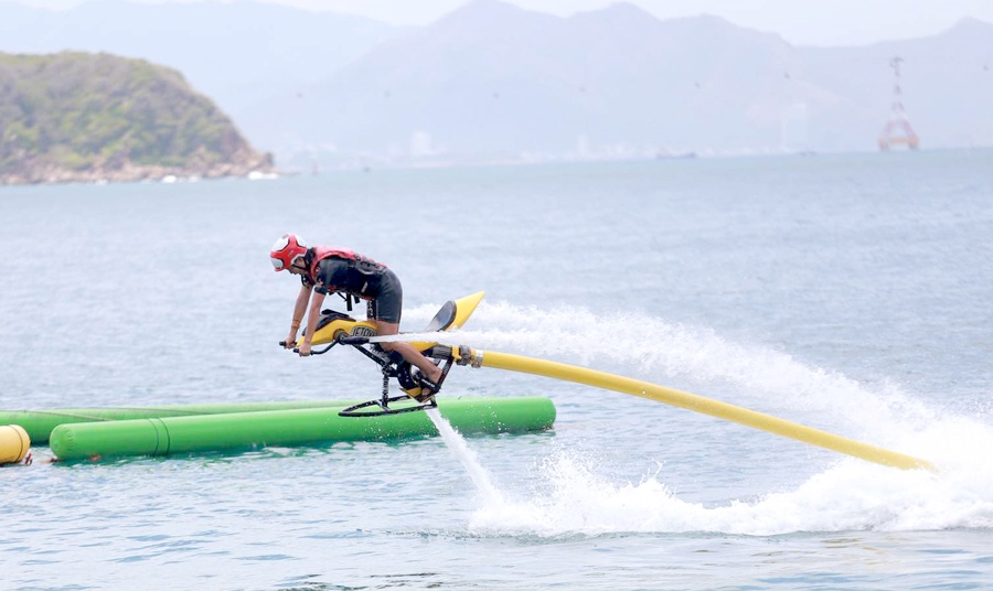 | Trong chặng Nha Trang, các đội chơi sẽ phải vượt qua thử thách với Flyboard - trò chơi cảm giác mạnh nổi tiếng của thành phố biển. Flyboard là thiết bị bay cá nhân sử dụng lực đẩy của nước. Một động cơ phản lực mạnh sẽ hút nước qua ống dài phía trước và đẩy ra với áp suất rất lớn, đưa người chơi lên độ cao 9 - 10m so với mặt nước. |