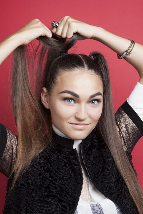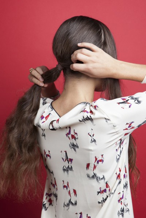 Trước tiên chia tóc thành hai phần, cột thật cao và chặt.