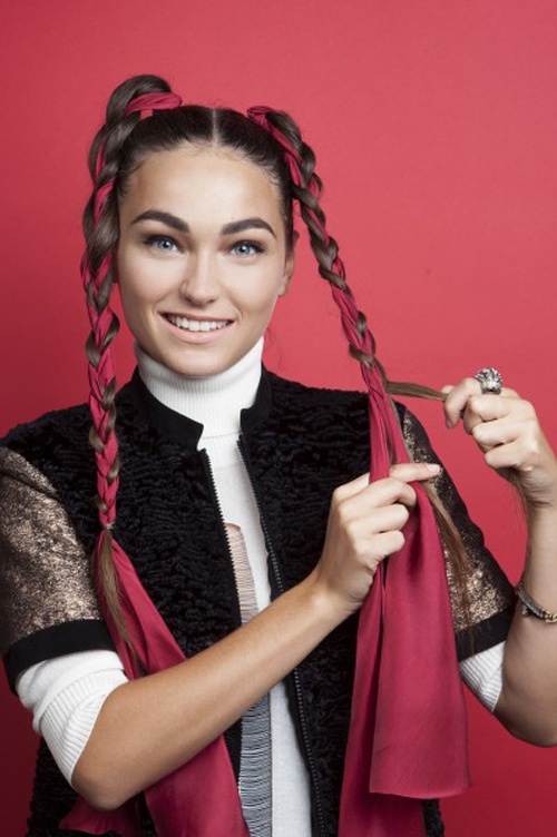 Giờ thì với mỗi bên tóc, bạn chia thành 2 phần, phần còn lại là ruy băng và thực hiện bước tết ba. Sau đó cột từng bên lại.