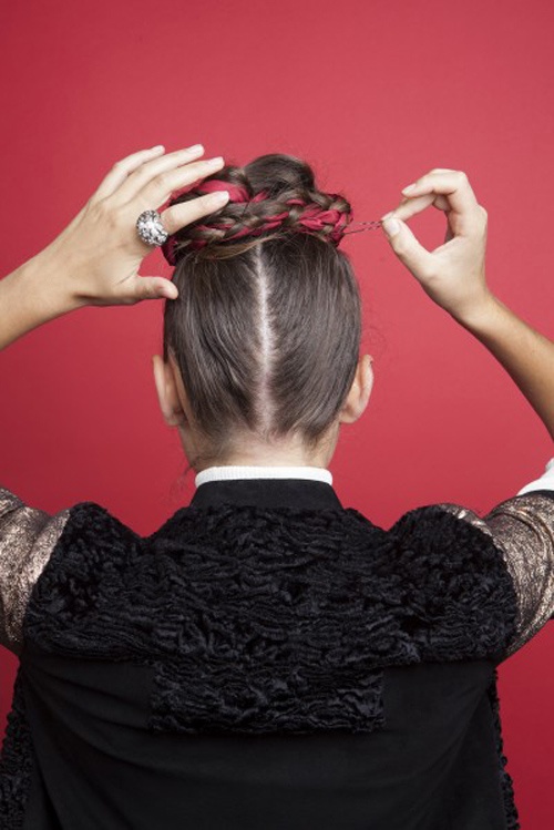 Vắt chéo 2 bím tóc lên đỉnh đầu, quấn tròn lại cho tới khi hết tóc và kẹp ghim lại.
