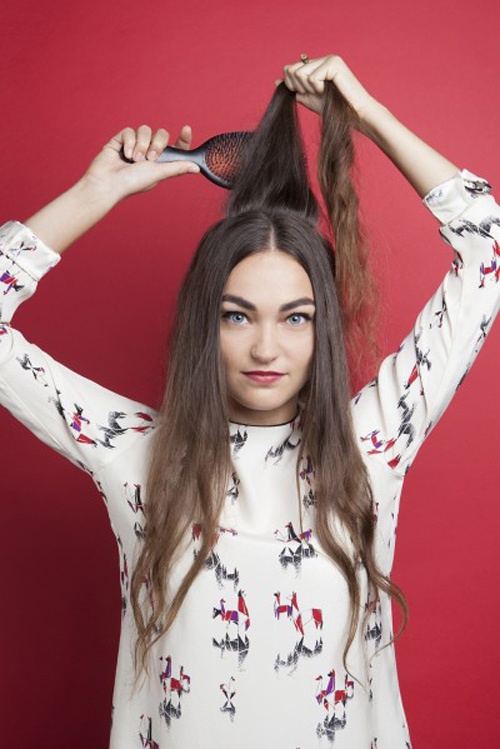 Trước tiên bạn rẽ ngôi giữa, chia tóc thành 3 phần: 2 bên thái dương và phía sau. Với phần tóc trên đỉnh, dùng lược đánh rối để tăng độ phồng tự nhiên cho tóc.