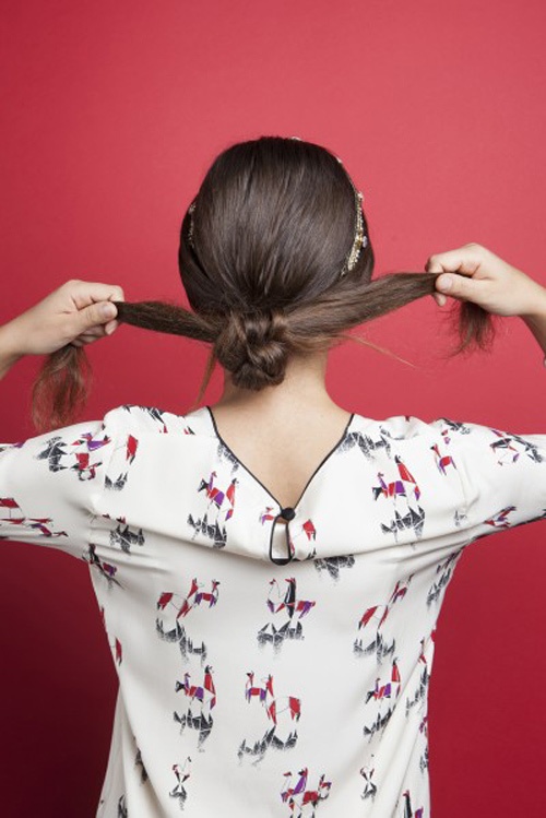 Khi ba phần tóc đã tập trung về một góc, bạn chia đôi chúng ra và thực hiện thắt nút cho tóc. Có thể thắt hai, ba nút tùy theo độ dài. Còn phần đuôi tóc thừa, bạn xoắn lại và giấu đuôi tóc với kẹp ghim. Cuối cùng sử dụng gôm để cố định nếp tóc.