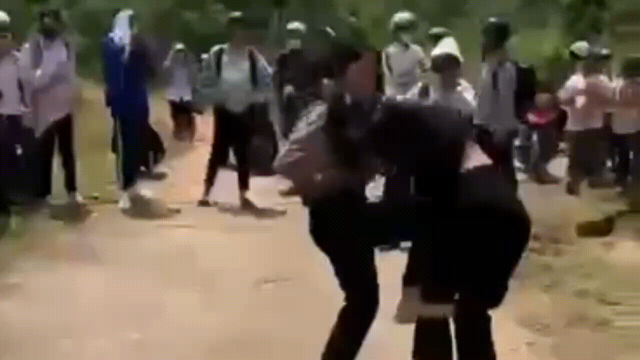 Hai học sinh đánh nhau, xung quanh nhóm bạn reo hò, cổ vũ phản cảm. Ảnh: Cắt từ clip. |