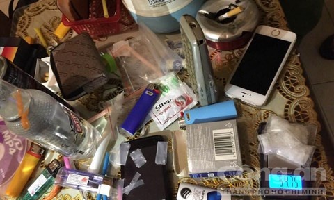 Qua kiểm tra trong phòng, cơ quan công an còn thu giữ 5 gói ma túy đá, 2 bộ dụng cụ sử dụng ma túy đá, cân tiểu ly và gần 6,7 triệu đồng.