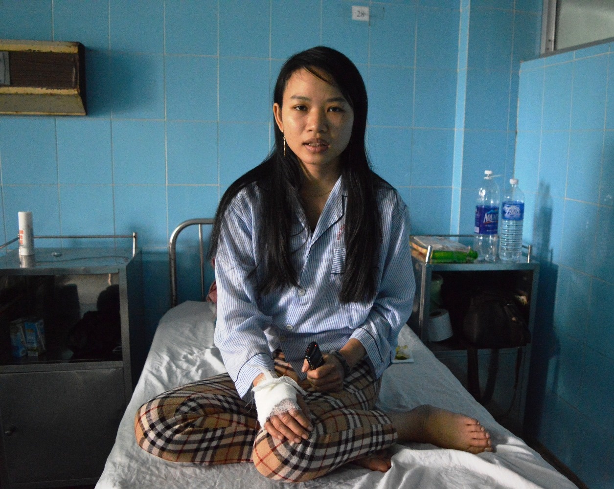 Chị Ngô Thị Hồng Vân, đang điều trị tại Phòng cách ly của khoa Chấn thương chỉnh hình, cho biết: "Hai kẻ hành hung 27 - 28 tuổi, đi xe AirBlade màu trắng đen. Em kéo xe máy không cho họ chạy nên bị đạp vào bụng. Thấy ba gục xuống nên em vào chở đi viện, sau đó thì không biết gì nữa”.