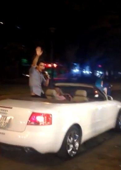 | Hình ảnh thanh niên Sài Gòn ngồi xe Audi mui trần đi bán kẹo kéo từng gây bão trên mạng xã hội tại Việt Nam. Ảnh: Cắt từ clip. |