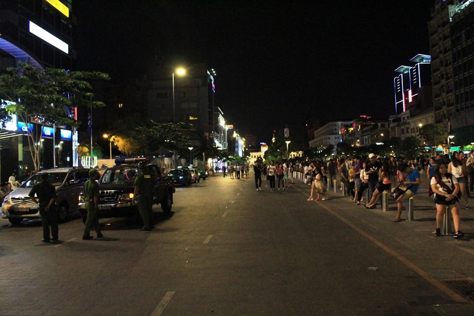| Đến 22h, phố đi bộ đã ổn định trở lại nhưng công an vẫn còn túc trực. Ảnh: Trường Nguyên. |
