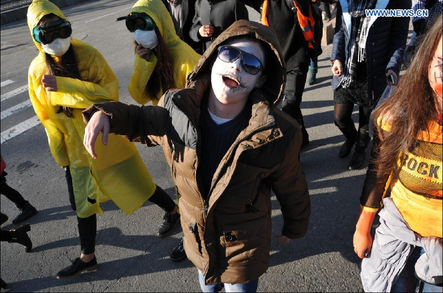 | Một chàng trai trẻ hóa thân thành zombie trong lễ hội Halloween tại Kyrgyzstan. Ảnh: Tân Hoa Xã |