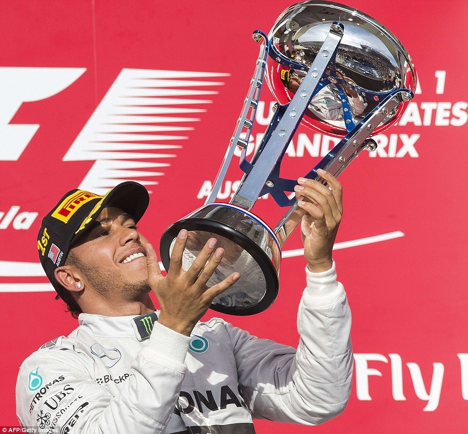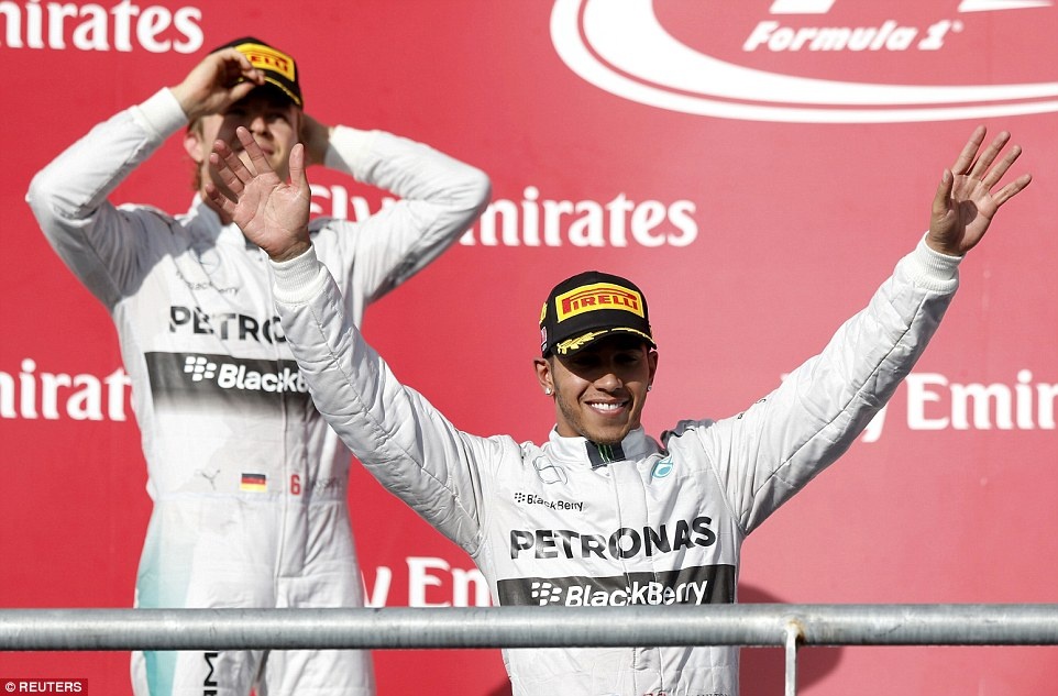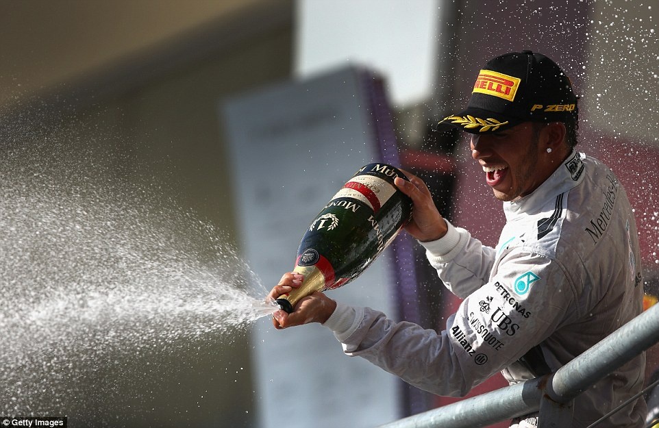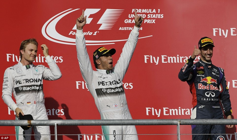 | Tay đua 29 tuổi tỏ ra rất phấn khích với chiến thắng tại US GP 2014. Về sau 2 tay đua của Mercedes là tay lái trẻ của Red Bull, Daniel Ricciardo. |
