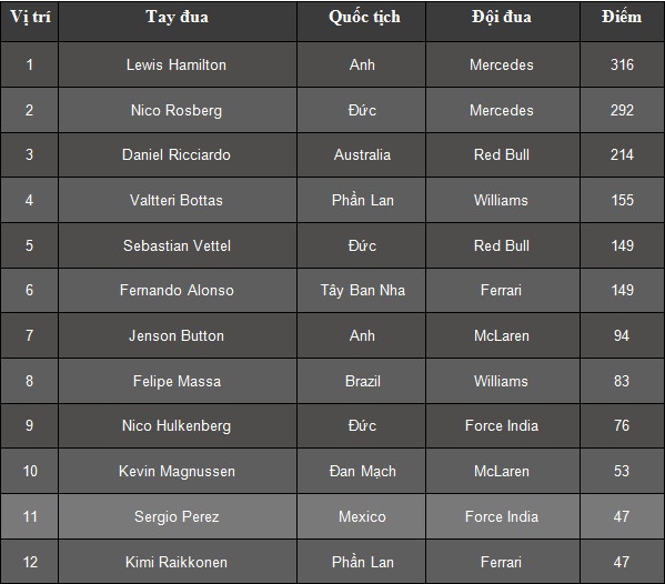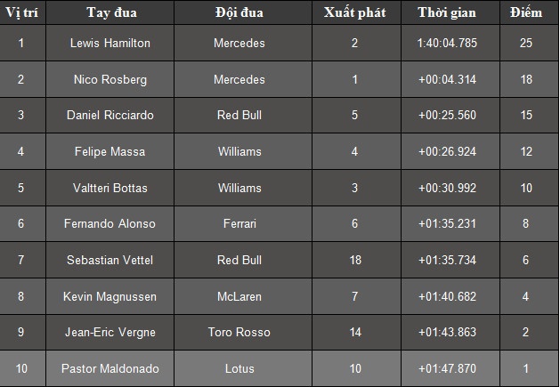 | Chức vô địch tại Austin giúp Hamilton bỏ xa đồng nghiệp Rosberg tới 24 điểm trong khi mùa giải 2014 chỉ còn 2 chặng đua nữa tại Brazil và UAE. |