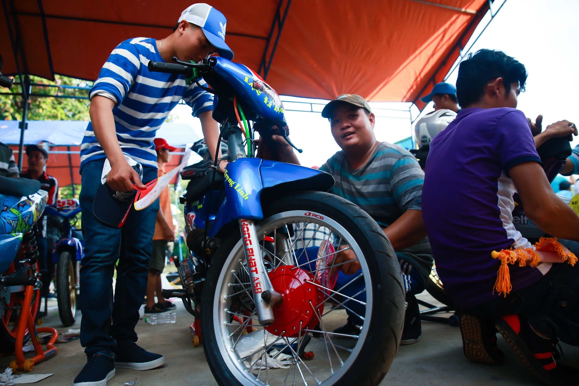 | Vẻ quyết tâm hiện trên khuôn mặt các tay đua trước giờ thi đấu. Nhiều người lần đầu thử thách trước một trường đua chuyên nghiệp nên khá căng thẳng. |